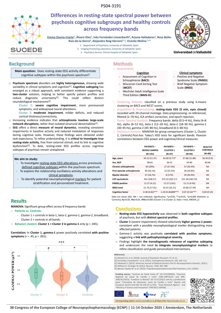Acudimos al 38 Congress of the European College of Neuropsychopharmacology (ECNP) | 11-14 October 2025 | Amsterdam, The Netherlands | con la siguiente comunicación: «Differences in resting-state spectral power between psychosis cognitive subgroups and healthy controls across frequency bands» (Osorio-Iriarte et al., 2025)